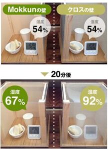 木の塗り壁Mokkunを使って行った消臭実験では、強いアンモニア臭(公衆トイレの約2倍の濃度)が、最初の5分でモックンの試験体の濃度が大幅に減している点に注目です。およそ10分後には、半分以下の数値が、120分後には臭気を検知できない程の数値が実証されました。