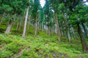 間伐され手入れが行き届いた竹林では、日の光が土壌まで差し込みます。