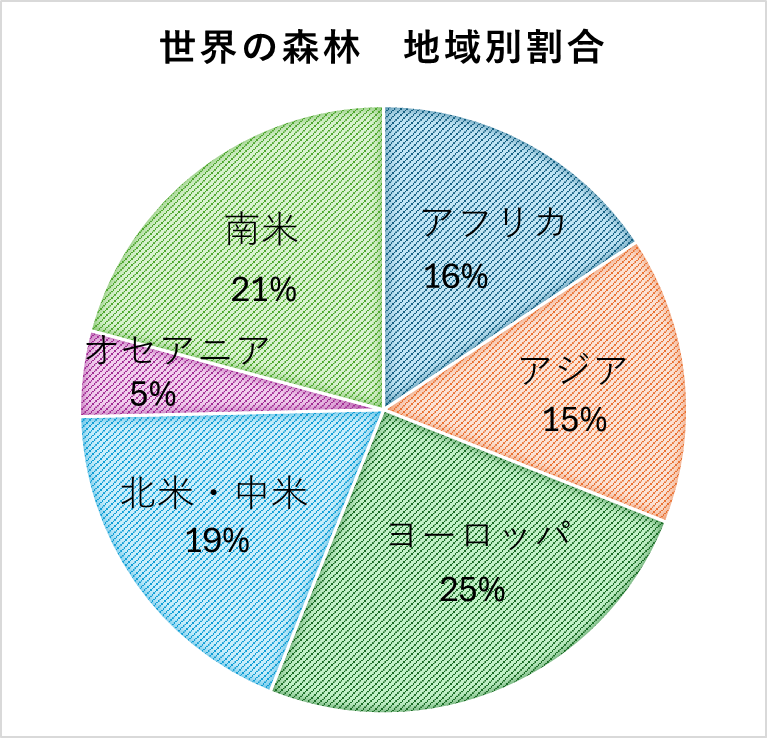地球上の森林面積は、約40億ヘクタール。これは地球の陸地の約3割に相当します。地域別に見ると、最も森林面積が広いのはヨーロッパ、次いで南米、北中米と続きます。国別では、ロシア、ブラジル、カナダ、アメリカ、中国が上位を占めており、いずれも広大な国土を持つ国々です。