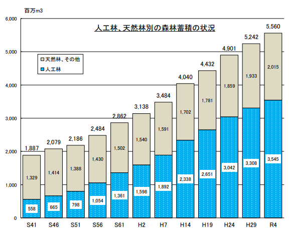 さらに、日本の森林は過去60年間ほとんど面積が変わらず、安定して保護されてきました。木の蓄積量(森林にある木材の量)も年々増加しており、過去60年で約3倍に達しています。これは、先人達が森林を健全に育くんできた証です。